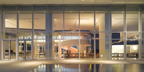 Composed of two main buildings and supporting facilities nestled into a hill of dense pine trees, Se...