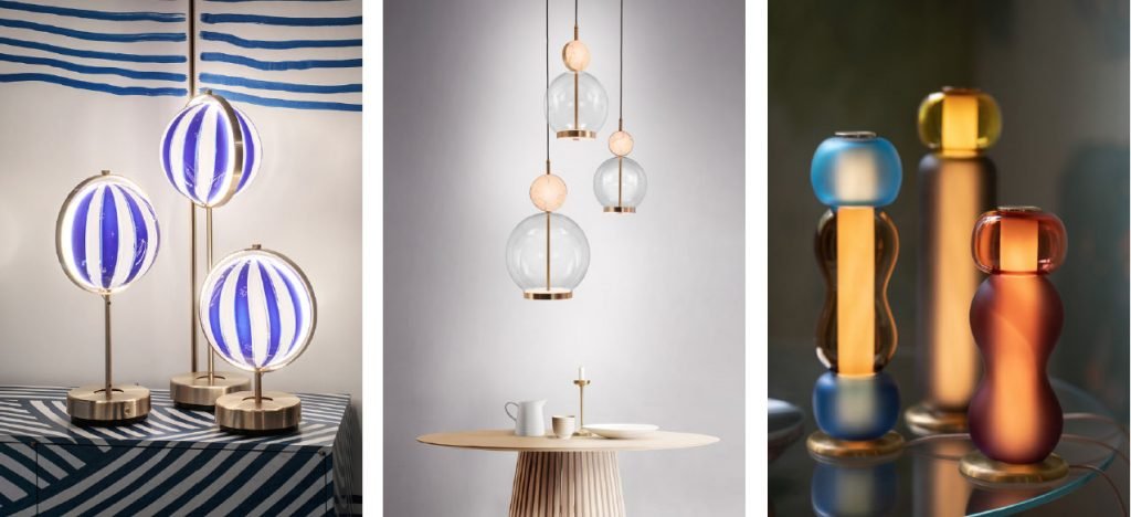 Left to right: BG – Baroncelli Orion Swirl Table Lamps; Marc Wood-Rosa-3 Piece-Lifestyle 1; Drift, Lunar & Surge. Curiousa