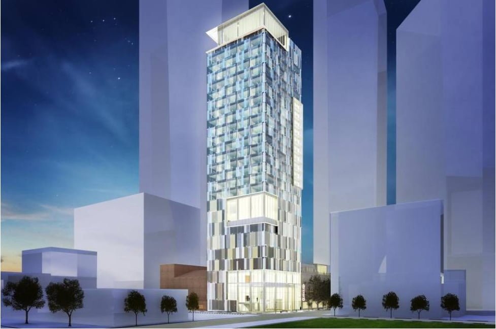 The 250-room hotel is planned to total 20 stories. Atop the five-story theatre, that would bring the project’s total height to 25 stories.