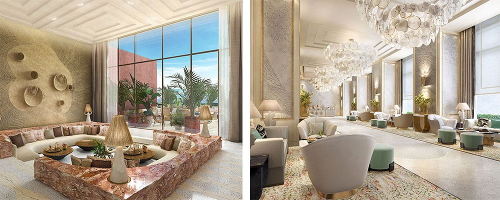 Left image: The Lobby Lounge St. Regis Marrakech, Morocco. Right image: ‘Peacock Alley’ at Waldorf Astoria Doha, Qatar
