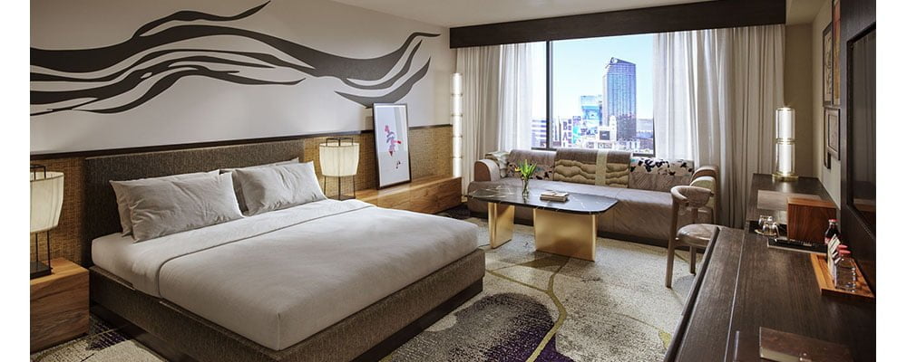 To create a more modern, residential feel at Nobu Hotel Caesars Palace, the award-winning global architecture and design firm Rockwell Group has re-envisioned the guest rooms and common areas it first designed in 2013. Rockwell Group has drawn inspiration from kintsugi, the Japanese art of repairing broken pottery with gold epoxy – creating cohesion from collage. This element will create a streamlined, lighter and more luxe take on the original design concept.