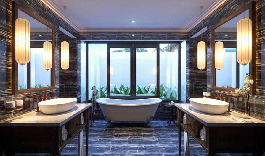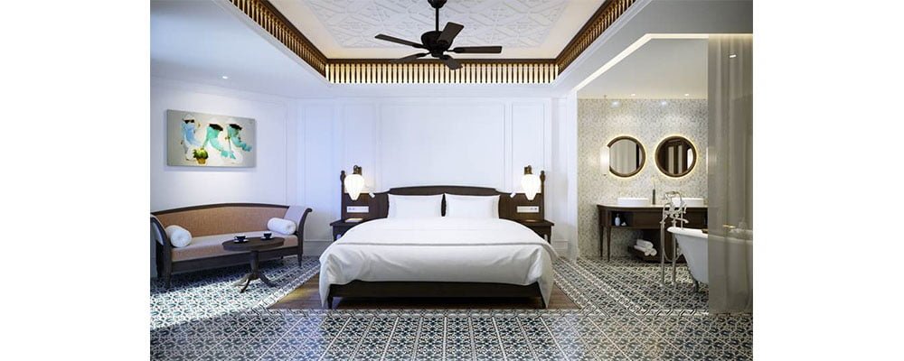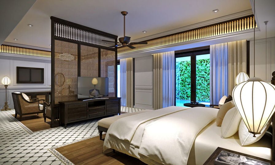 Like its predecessor, The Anam Mui Ne’s design is an echo out of Vietnam’s bygone Indochine period, with architecture guided by Hanoi’s grand old French villas. Evoking a romantic atmosphere, the likes of glowing lanterns, customized encaustic mosaic tiles, big-bellied clay water vases, statues on plinths, imperial style roofs, cornice detailing and intricate woodwork have been crafted by artisans from across Vietnam whose trades have been handed down the generations. Giving way to an infinity pool and the ocean beyond, the lobby makes for a striking first impression, replete with a grand piano and a sloping roof fashioned with glass panels that water gently flows over, casting faint shadows underneath.