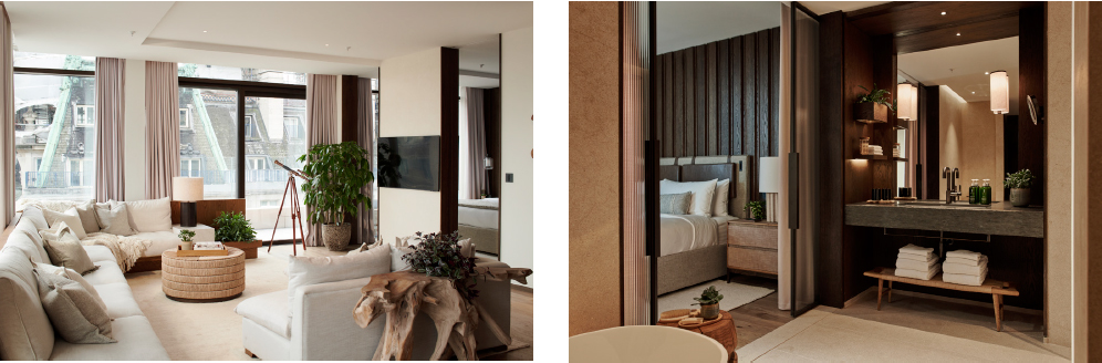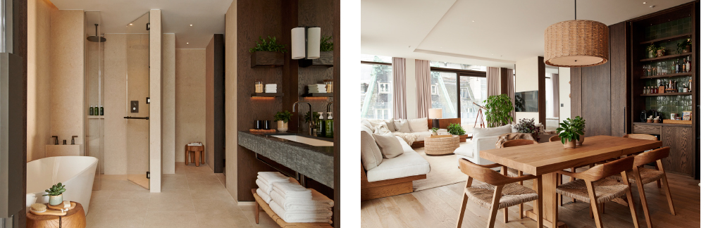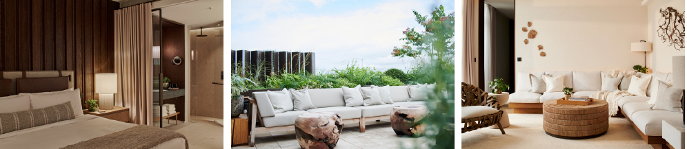 The nature-focused hotel houses 181 rooms, including 44 suites – four of which are signature suites, which, alongside the penthouse, offer in-room spa treatments, private personal training sessions and fitness classes including yoga and Pilates. The penthouse and Signature Suites also boast a beautifully designed minibar and bespoke cocktail kit, with a full selection of premium spirits, including X Muse Vodka, Stagg Bourbon, and 1942 Tequila, as well as a selection of fine wines and Champagne, to be enjoyed in a stylish John Jenkins & Mark Thomas glass. As with the rest of the hotel, GA Group’s design story for the penthouse and Signature Suites follows an au naturale suit, but with dialled-up luxury. The quiet opulence of the design is found in the attention to detail – the seamless quality of finishes, ethically sourced materials, and the considered curation of chic furniture and plush furnishings.