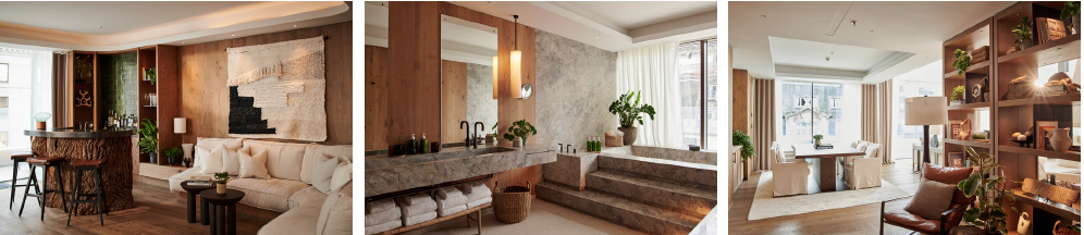 The suite features an indoor dining room for six, sofa seating for ten, a spacious living room with luxurious touches, organic tones and tactile detailing, an oversized private bedroom complete with an plush Emperor bed, and a thoughtfully designed bathroom with walk-in shower and an ultra-deep freestanding bathtub.