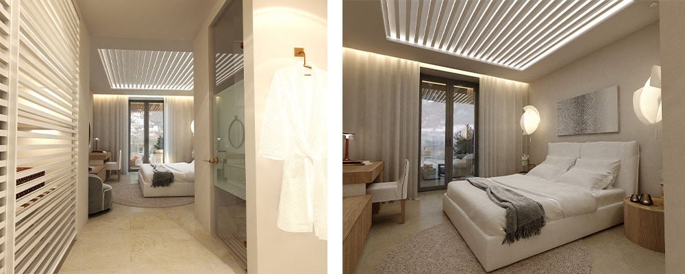 Located on the southwest coast of Mykonos, this former luxury villa was once home to a prominent businessman and his famous guests. The property has been reimagined as Mykonos’ latest five-star island resort, boasting 59 spectacular rooms with magnificent views of the South Aegean, including three Signature Suites and two 2-bedroom villas with private pools. The resort expertly combines the beauty of its natural surroundings with modern contemporary design, while an extra touch of comfort and cosiness creates the feeling of a home away from home. Sophisticated rooms and suites have been designed to reflect the authentic Cycladic style, with luxurious finishes ensuring a tranquil environment in which guests can relax.