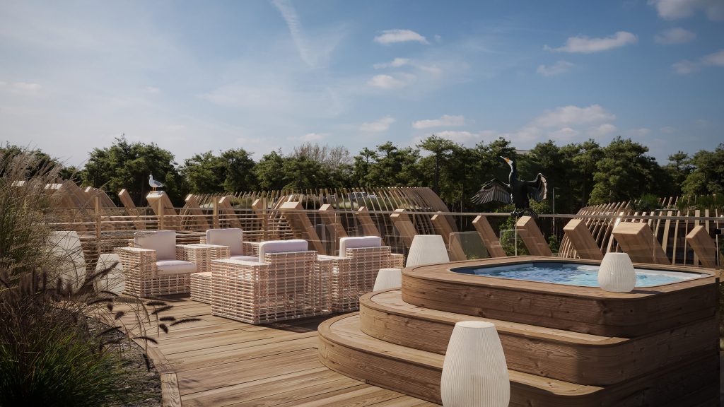 Around the pavilions, new dunes, heaths, and groves of dwarf pines will be created using only native species. Ponds will attract amphibians, deadwood will provide shelter for hedgehogs, and nesting boxes on trees and façades will once again invite birds to the island.