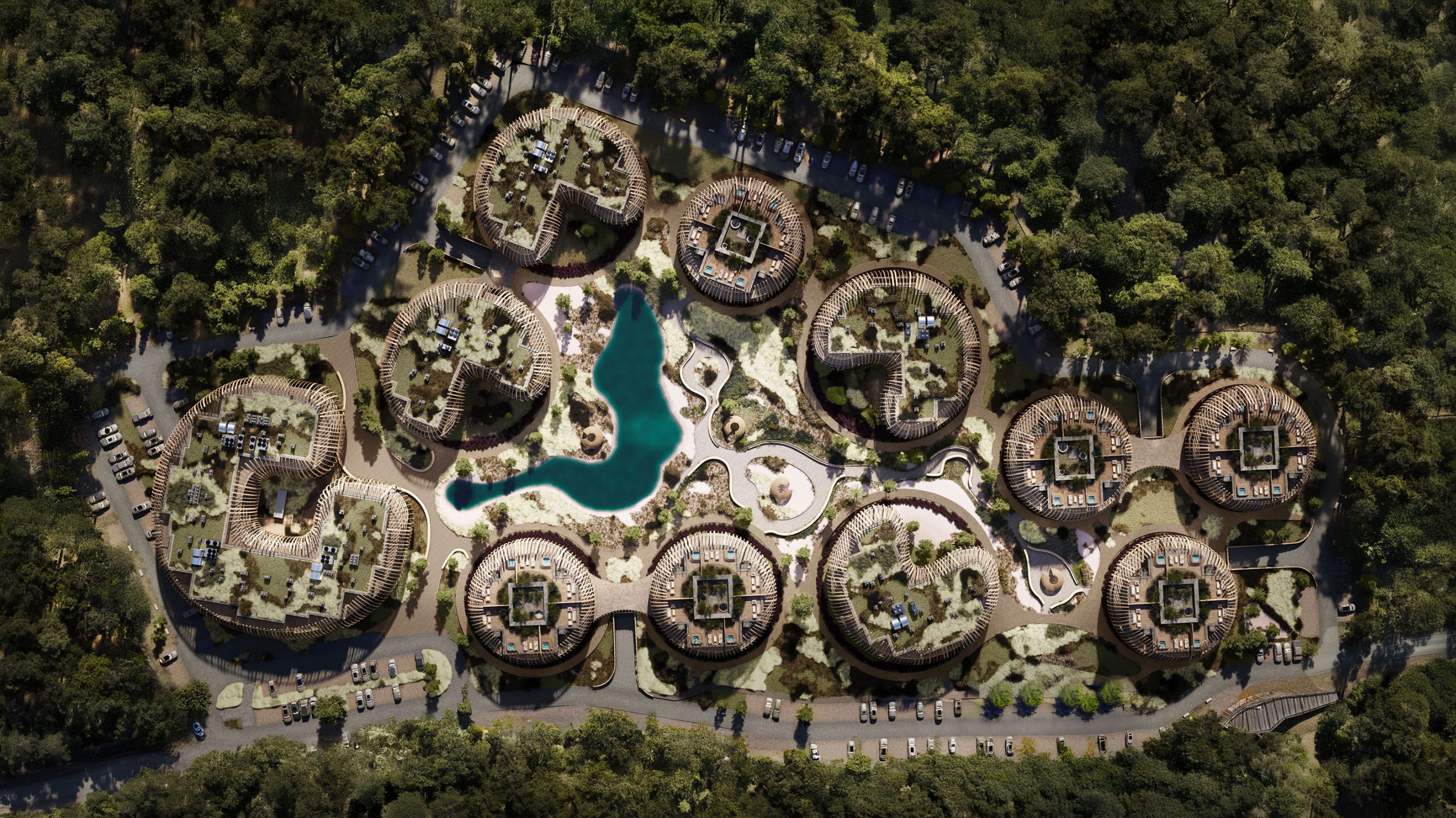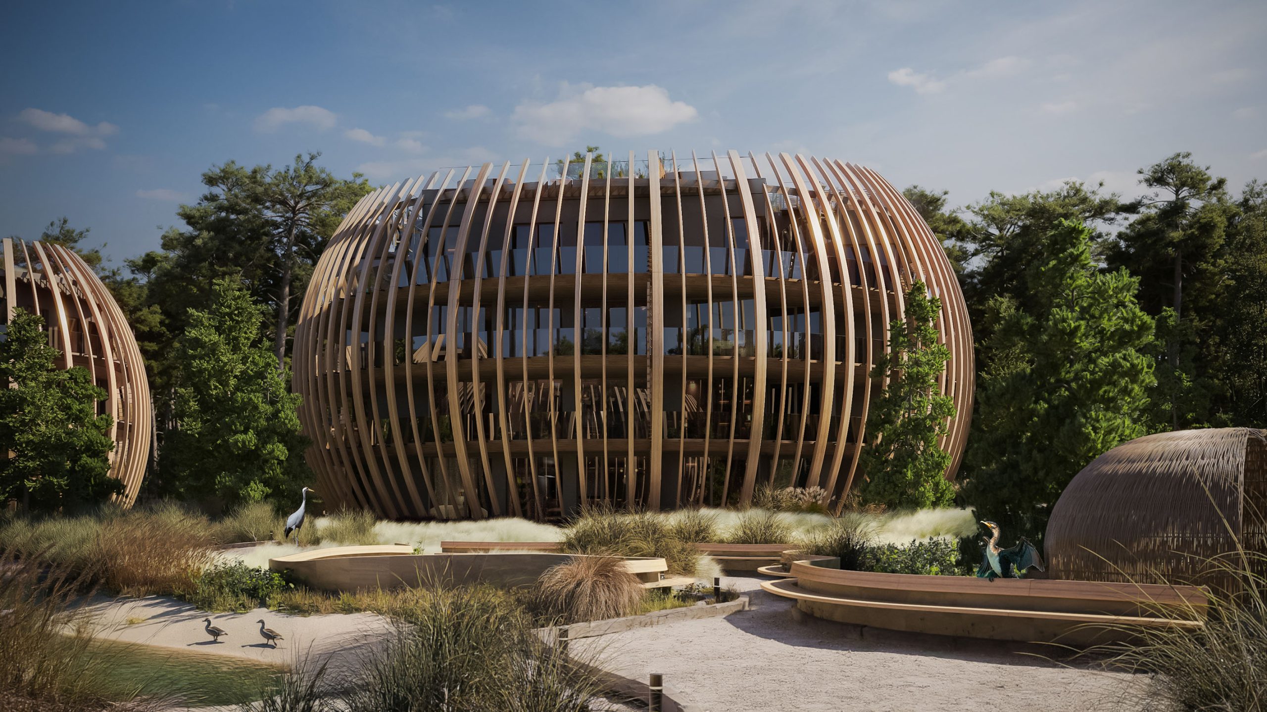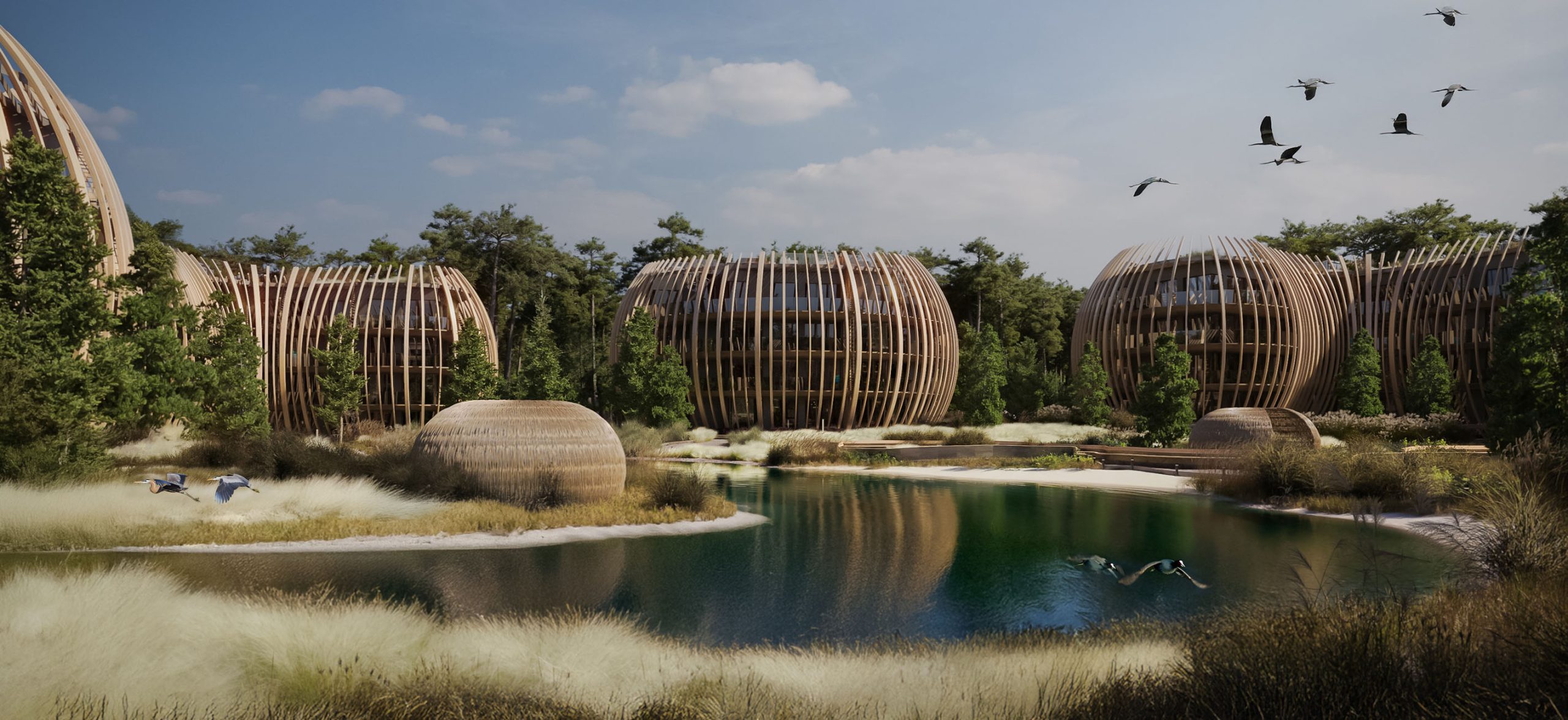 The pavilions’ soft, organic forms and façades made of wood, stone, and glass harmonize with the hues of sand, water, and forest
