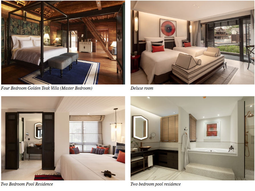 The spacious rooms, one-and-two-bedroom pool residences and a four-bedroom teak villa with a private swimming pool merge traditional Thai design with a soothing palate of natural hues, sophisticated furnishings and tech-savvy facilities. The four-bedroom Teak Villa is made from antique golden teak that was collected by the owner before being restored and carefully reassembled into a new structure that welcomes groups of family and friends to enjoy a traditional Thai living experience with modern comforts.