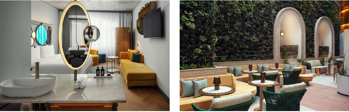 Encapsulating the hotel’s vision of both tradition and modernity, the hotel’s 161 distinctive guestrooms, including 23 suites, feature striking colors and reflective textures, creating a refined ambiance. The E-WOW Suite on the 8th floor echoes the architecture of the new building whilst embracing Art Nouveau styles partitioning the room for guests to recharge, entertain, and work. The WOW Bohemia Duplex in the heritage building features restored beams and decorative arch windows, finished in a deep grenache color palette. An oversized curtain lends a theatrical air that accentuates the suite’s double height ceilings, while creating a sanctuary on the upper floor. Skylights allow natural light into the restored loft-like space and plaster finished walls hark back to building’s illustrious legacy.