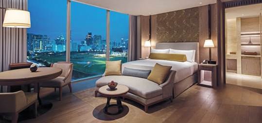 The ten 100 sq. m. Astoria Suites feature a bedroom, separate living and dining area, powder room and private pantry. The two 150 sq. m. Waldorf Suites each feature two en-suite bedrooms and an entrance foyer in dramatic mineral blue that opens out into the airy living and dining area. The expansive 300 sq. m. Royal Suite offers an exceptional cityscape that includes The Royal Bangkok Sport Club and features two bedrooms, separate living room and a dining room for eight with fully-equipped kitchen and bar counter.