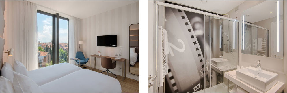 Avani Rio Novo showcases Italian Rationalist architecture in its clean lines and geometric shapes. The interiors celebrate Venice’s strong connection to the world of cinema, particularly due to the annual Venice Film Festival that attracts renowned figures from the global film industry. From stylish common areas and rooms dotted with cinema memorabilia to the signature restaurant hung with portraits of movie stars and a mini-library with magazines and books on the subject, the hotel is a love letter to Italian cinema. Calming rooms and suites in monochrome shades feature elegant parquet floors and full-height windows that let in Venice’s enchanting light. They also provide panoramic views of tiled rooftops and occasional canal-side gardens, offering a glimpse into the city’s daily life.