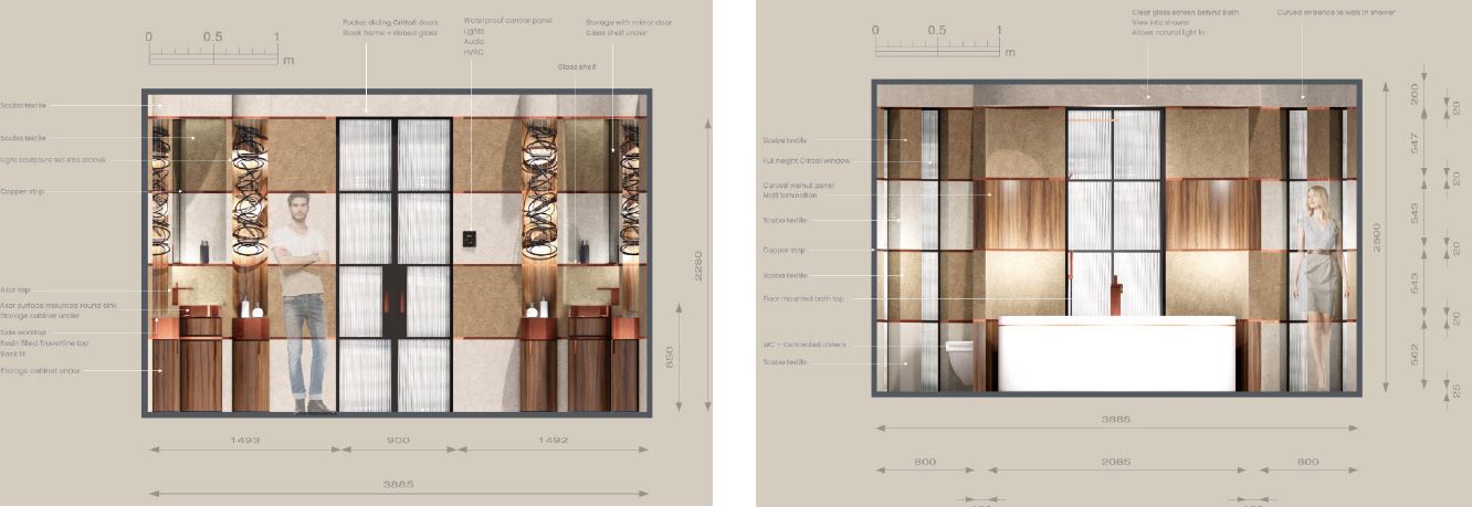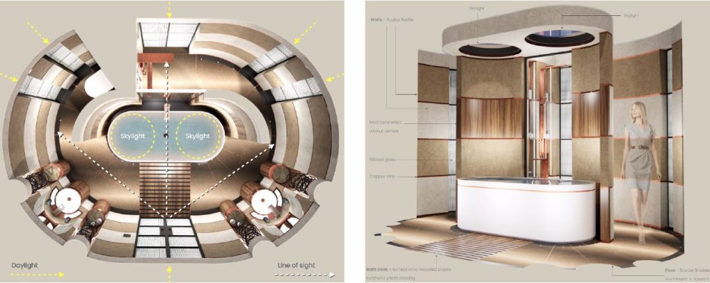 He explains the thinking behind his award-winning concept. “My inspiration for the bathroom design came from the idea of creating a space that enclosed and protected the client from the outside world. I wanted to develop an inner space that wrapped around them in a warm embrace and where they could relax and be themselves.”