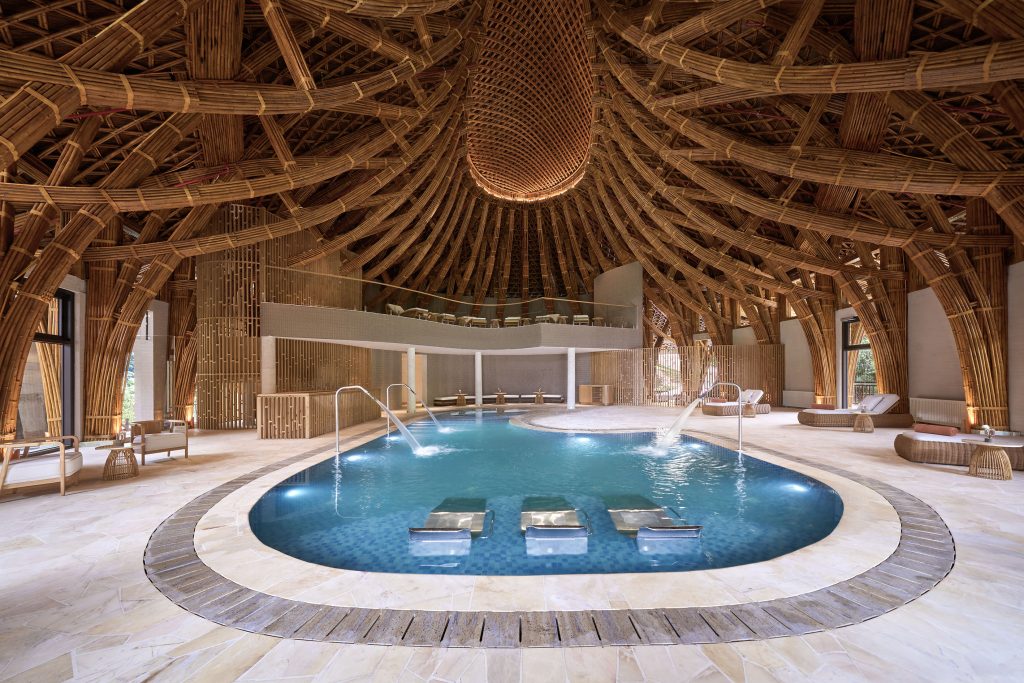 The rooms, suites, and villas, ranging from 30 to 154 square metres, offer panoramic views of the tranquil countryside. The Mu Cang Chai Pool Suite and Mountain View Pool Villa feature bamboo accents, a cultural symbol of Vietnam, with brocade motifs typical of the H’Mong people. The Wellbeing Suite and Wellbeing Pool Suite cater to guests seeking a peaceful and rejuvenating escape, with access to the Hydro Wellbeing Area and inclusive spa treatments. Each villa is connected by tree-lined pathways and lush gardens with native flora—including the region’s iconic Tớ Dày flower.
