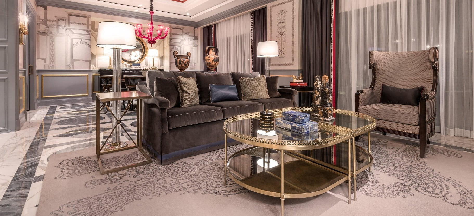 The villas, designed by leading firm KNA Design, blend various architectural styles with an eclectic mix of furniture and décor, resulting in the appearance of a worldly collection of styles worthy of a well‐travelled aristocrat. Furnishings are a combination of highly detailed, hand-carved items mixed with more simple, streamlined yet sophisticated pieces. The Palace Tower villas were designed with four primary aesthetics in mind: