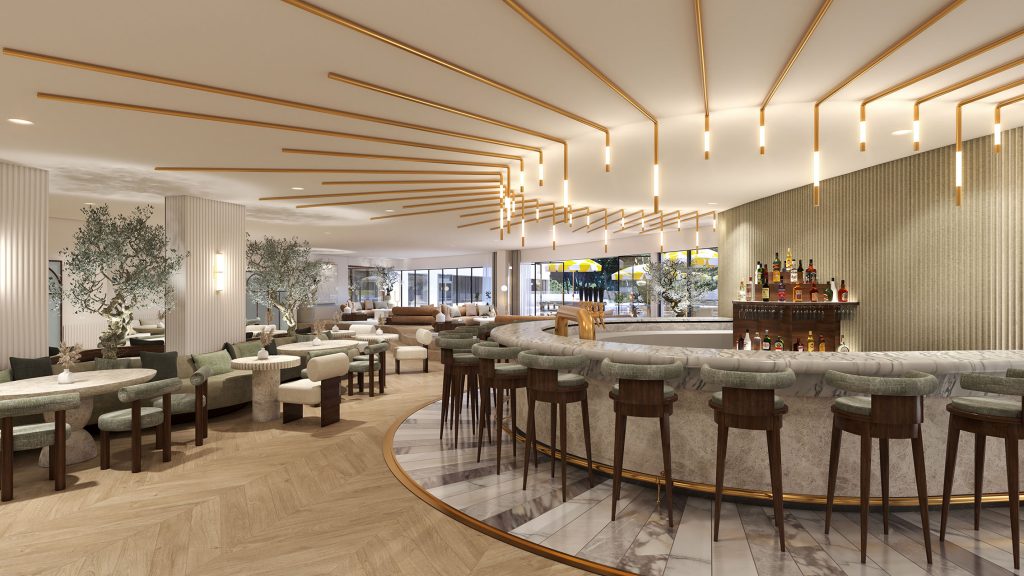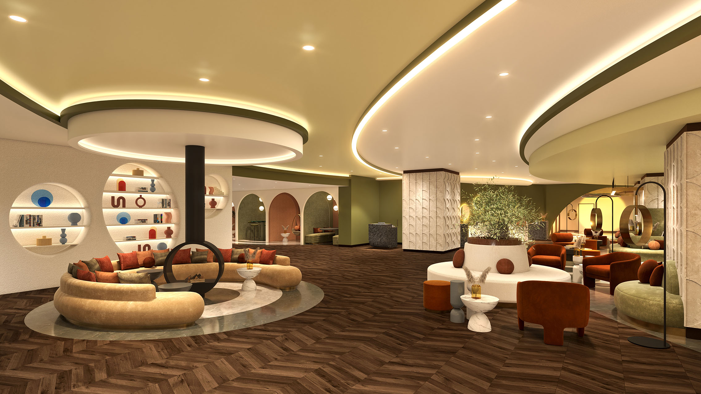 The hotel’s interiors have been brought to life by award-winning Amsterdam-based designer, Saar Zafrir, who drew inspiration from ancient history. “In Roman times, ‘otium’ referred to being free from commitments,” he says. “Our goal is to immerse guests in this tradition of indulgence, luxury and comfort, where every moment is meant to be savoured.” This concept is reflected in an elegant palette reminiscent of the Roman Empire, featuring rich olive green, warm terracotta, and subtly sophisticated off-white. The inviting, spacious lobby fosters a sense of community, with playful geometry, dramatic arches, and distinct 3D wall textures enhancing its visual appeal.