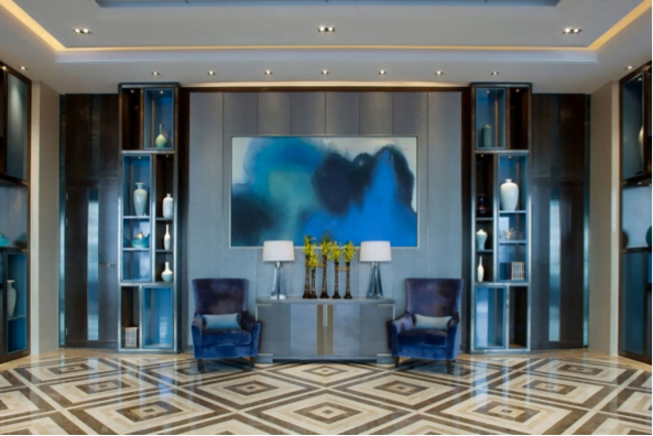 The refurbished Horizon Club rooms and suites each come complete with classic royal furnishings; the silk gold accent feature-wall panels highlight the formal elegant proportion of the trimmings and layers of a palace’s interior. All padded and buttery leather headboards give every guest a sense of comfort and luxury. An interior millwork of refined oak and walnut delivers a rich and classic sense of touch and is fundamental to the bespoke furniture used throughout the hotel and in the new rooms and club lounge. Central to the new design is the theme of enhancing“East meets West”ethos and to reflect a modern China of the 21st Century, while honouring Chinese heritage.