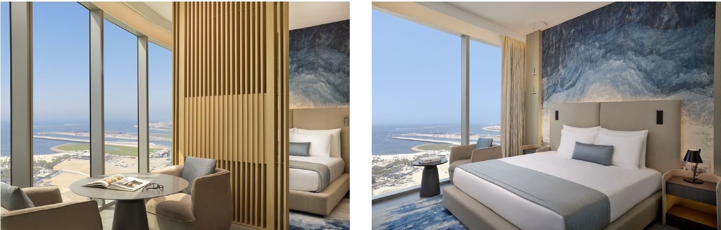 Suite. The hotel will comprise 1,004 luxuriously designed rooms and suites, all with floor-to-ceiling glass windows showcasing panoramic views of Palm Jumeirah, the Arabian Gulf, and Dubai’s glittering skyline.