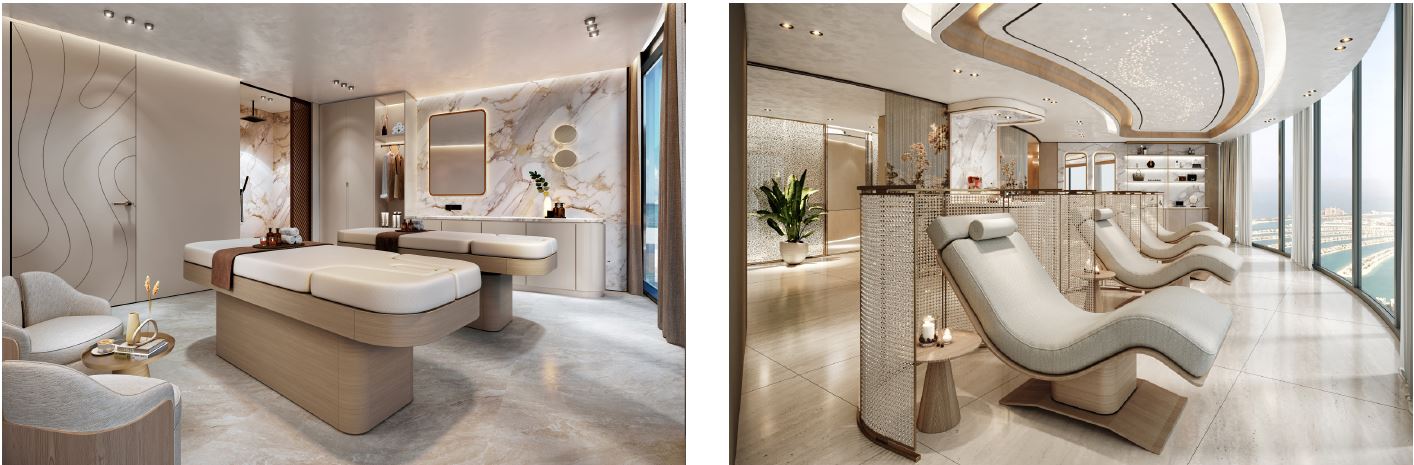 Left: Spa Treatment Rooms. Right: Spa Waiting Deck & Beverages Station