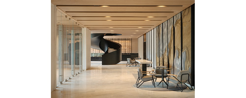 On the third floor, the light-filled all-day dining restaurant is intelligently designed for functionality throughout the day, while the adjacent Indian restaurant draws inspiration from 1920s Bombay Deco style, featuring dark veneered walls with gold detailing. Both restaurants offer expansive terraces adjacent to the spacious pool deck and overlooking the campus sculpture garden.