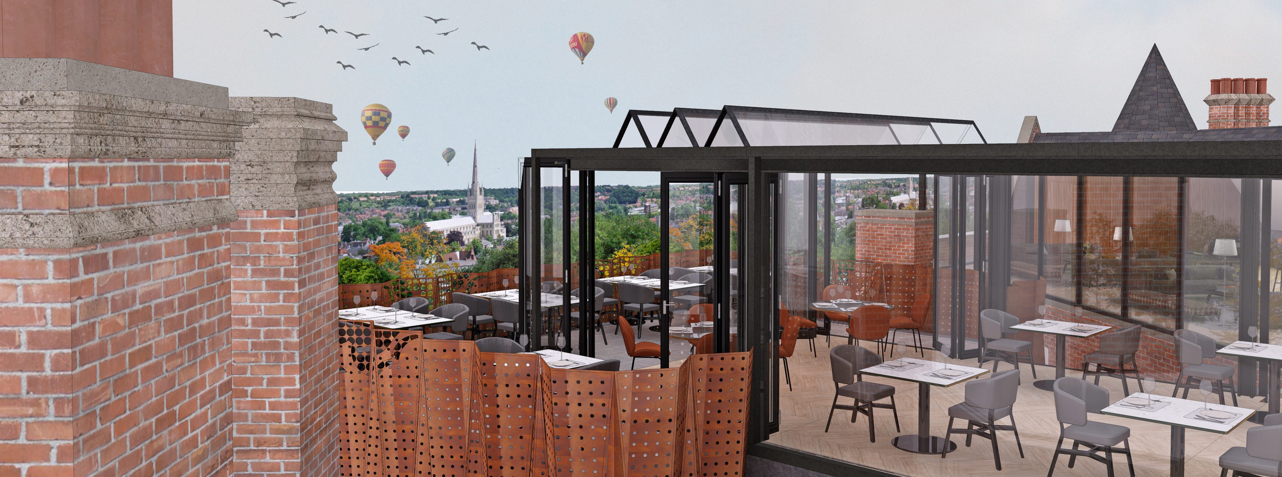 In its latest project with internationally renowned hoteliers Accor Hotels, the award-winning architects and interior designers will refurbish the extravagant exterior, add a lightwell extension with a graceful glazed link and further guest rooms in a simple flat parapet rooftop form. A rooftop terrace, with Sky bar and restaurant, for hotel guests, outside visitors and local residents, will nestle within the Royal’s existing roofscape, giving stunning views of Norwich Cathedral. Inside, original detailing such as the ornate Drawing Room ceiling will be kept, with the great first floor ballroom becoming an open plan co-working space.