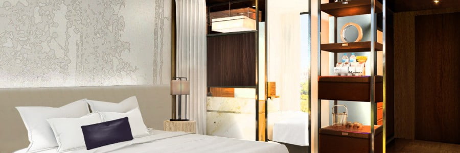 The concept of an experience that blurs the lines between indoors and outdoors is further emphasized by garden-inspired elements throughout the hotel, including strips of grass set between stone tile flooring and a trellis-inspired divider wall interspersed with candles. As guests step off the elevators into the guestroom corridors, they will encounter a playful hint of the outdoors with halls defined by a trellis and louvers in the ceiling lit to suggest daylight streaming through the wooden slats.