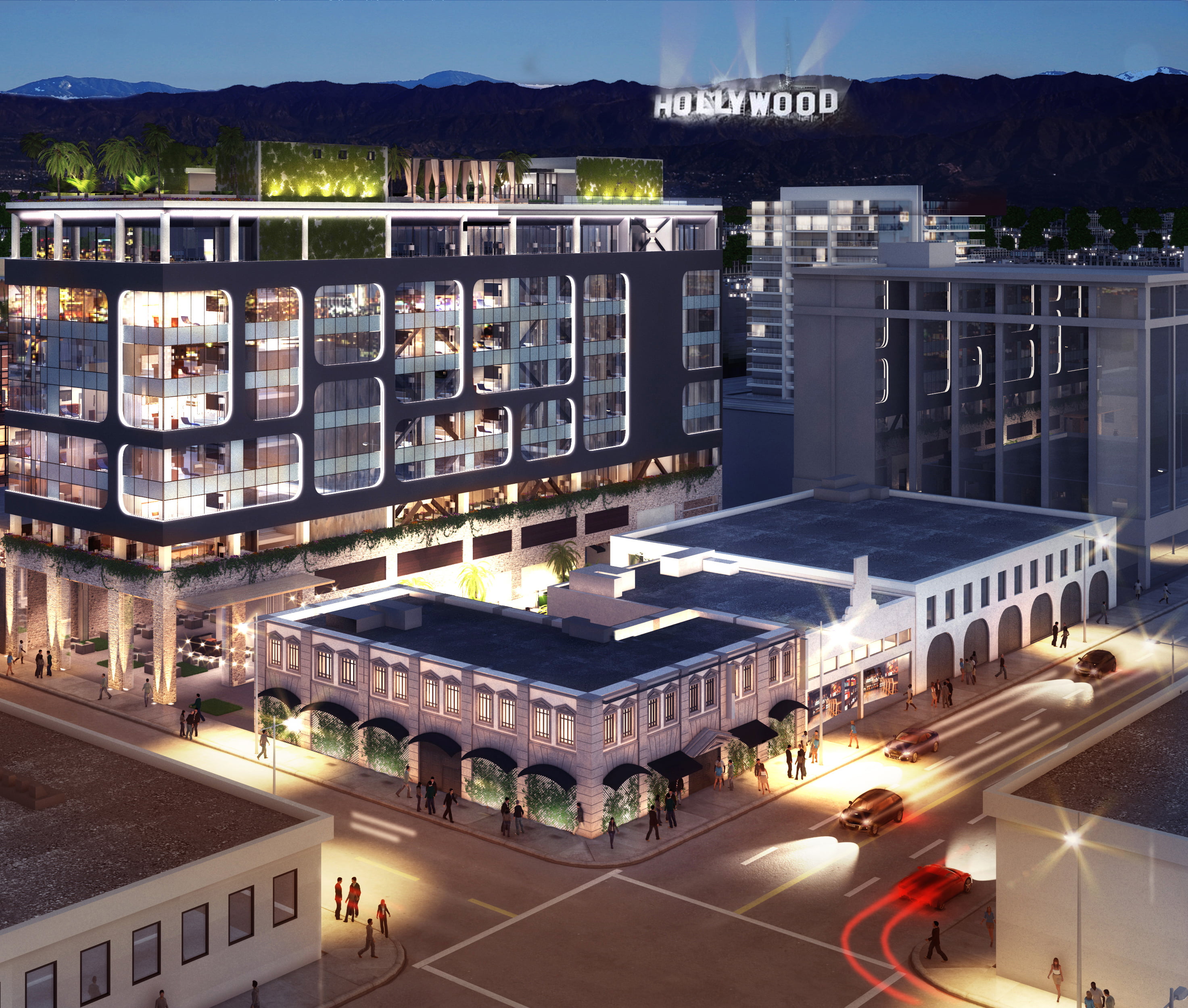 The 11,000 SF rooftop will be revolutionary to the Hollywood scene offering both public and private entrances that create a skyline destination for high-energy dancing, lounging and hand-crafted cocktails and award-winning dining. A nightlife venue will be enclosed with a retractable roof designed to maximize views of the iconic Hollywood sign and the surrounding landscape, the pool area will offer intimate and more communal seating groupings, including raised cabanas with a retractable top and sides, two-person chaises, a long daybed, and a firepit where guests can gather and a secret garden will serve as the inspiration for a rooftop café.