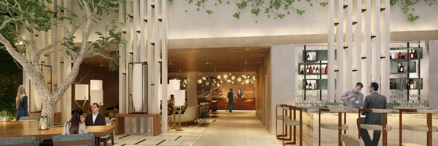 Similar to California hillside residences, the hotel will feature strong, seamless visual connections between the indoors and outdoors. The lobby will be an airy, light-filled retreat with a double-height space that will lead to a public landscaped pedestrian alley. A garden path subtly guides guests from the entrance to the check-in and concierge area and at night, lighting effects will mimic the shadows cast by the sun hitting trees and will be projected on the pathway.