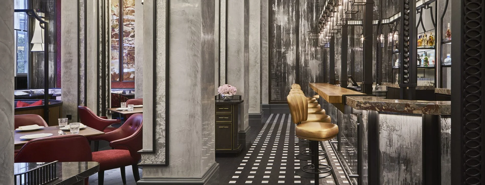 As all of the original columns from the 1922 building remain intact, Ed and Terence faced the unique design challenge to preserve the original mouldings, yet reinvent them with a new spirit and purpose. Intricate metal motifs have been erected on top of each column suspending three halo structures and resulting in three cosy alcoves for diners seeking privacy. The English heritage of the Grade II listed property establishes itself in the form of custom table lamps lining the large bronze-framed windows, which face the hotel’s courtyard.