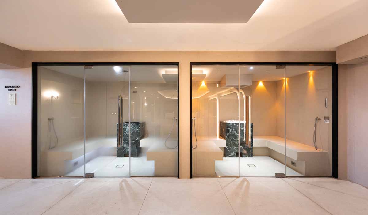 Water, an archetype of life and a symbol of regeneration, takes center stage in the 68 sqm pool, suspended in a rarefied and atmospheric environment. This space is designed as a sanctuary of peace and introspection, where guests can rediscover new forms of well-being. Dedicated neck-massage waterfalls alternate with comfortable hydromassage seating, delivering a deeply immersive and multisensory regenerative experience.