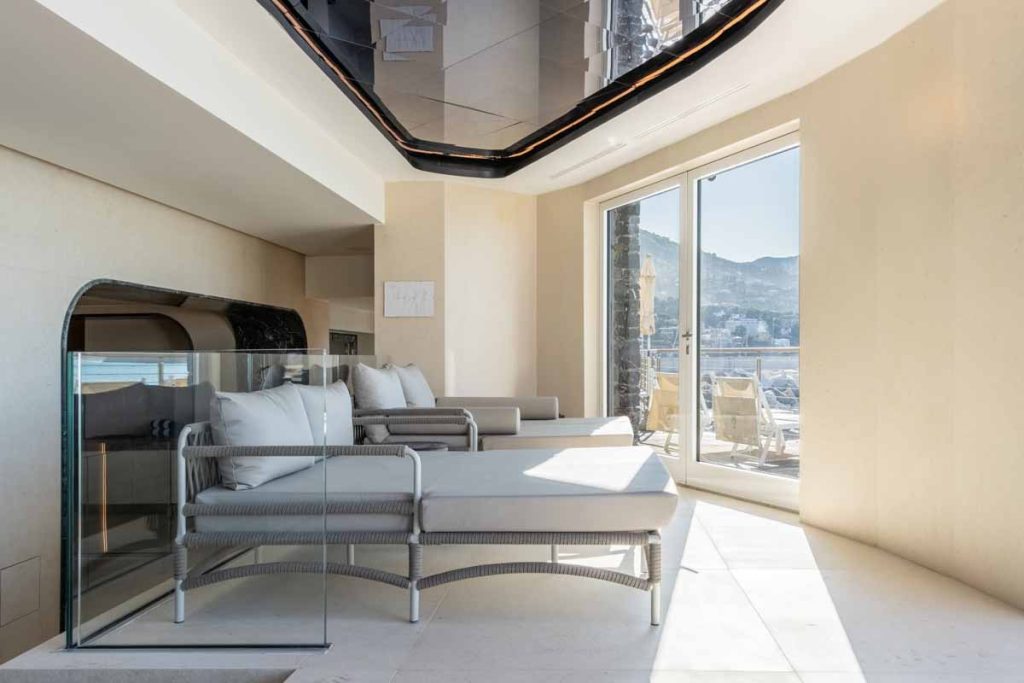 The Verde St. Denis effect finishes, with veining that recalls the reflections and movements of water along the coast, have been applied to highlight certain architectural elements and to custom furnishings, while surfaces treated with a travertine-effect coating evoke the Ligurian beaches.