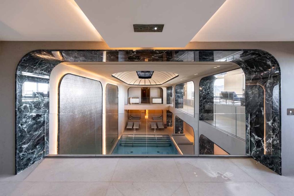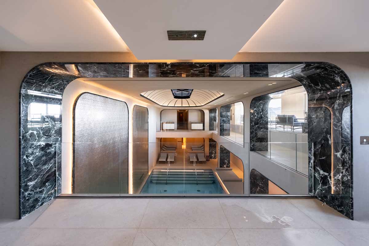 The fluid forms of the sea resonate within the interior architecture: large portals framed in green marble surround the pool, while expansive water-effect glass surfaces amplify its visual depth. A majestic reflective mirrored dome crowns the space, accentuating the double-height volume and conveying a sense of wonder and lightness.