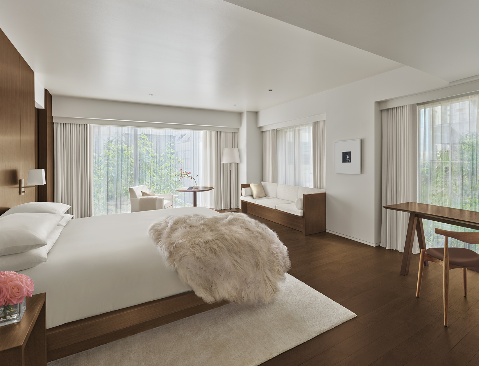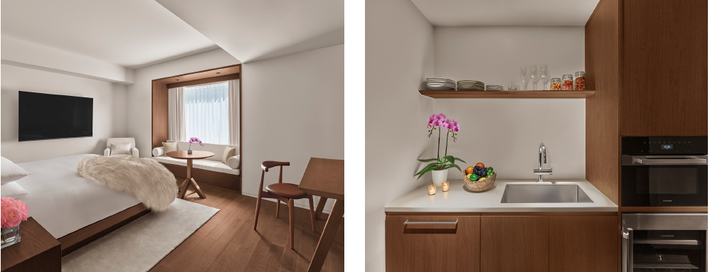 Taking pride of place in the lobby is another EDITION hallmark: a sculptural, head-turning staircase cast from white metal. It leads up to Punch Room, the inaugural Japanese outpost of EDITION’s innovative punch-focused bar concept. The intimate space on the lobby’s mezzanine floor flows into an enchantingly moody bar area where coffered walls and ceilings from dark walnut provide an elegant backdrop to tufted couches and chairs upholstered in jewel-hued brocade glinting like topaz and sapphire. Punch Room’s menu, illustrated by a local artist, gives a distinctively Japanese spin to the punch recipes originally found in the private clubs of 19th-century London. Inspired by Japanese culture, the drinks draw on local spirits and ingredients such as sake, ryokucha tea and spices from around the country, and come served as shareable cocktails in silver punch bowls with matching ladles. But Punch Room is more than an after-dark hangout. During the daytime, it’s the setting for the hotel’s Punch Room Afternoon Tea, where one-of-a-kind tea punches like a green tea yuzu paloma and a matcha-infused clarified milk punch come served with sweets, savories and intricate parfaits that celebrate Japan’s bountiful fruit varieties.
