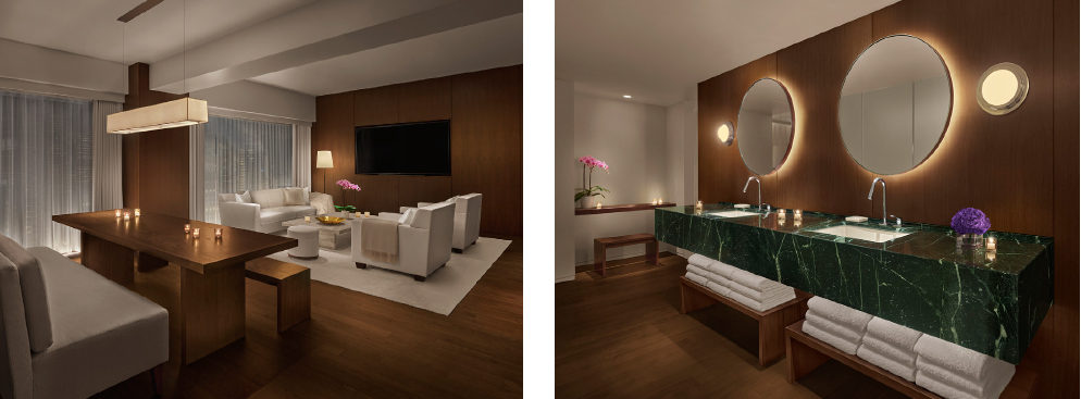 Whether they dig for the old or chase the new, guests will find a desirable base in The Tokyo EDITION, Ginza. Spread over 14 floors in a tower clad in vertical gardens and a latticed facade woven from metal, its 86 guestrooms range from 10 spacious suites with separate living areas to entry-level rooms whose minimum of 41 sqm/440 sqft of floor space make them the largest standard rooms in the district. Their clean-lined interiors weave EDITION’s timeless designs with Kengo Kuma’s distinct Japanese finesse, resulting in a modern marriage between Schrager’s New York sensibilities and the sharp traditional detailing that Kuma is known for. Floors and walls bedecked in walnut timber form a minimalist foundation for bespoke furnishing from travertine and cream-coloured leather, while the green marble basins and chrome fixtures in every bathroom nod to the district’s glossy varnish. Features of each guestroom include signature EDITION faux-fur throws in white and art by Sayaka Maruyama and Takay Photography. The Penthouse Suite, the hotel’s crown jewel on the 13th floor, unfolds into an open-plan living room, dining area, and a fully equipped pantry kitchen to cater to comfortable long-stays and intimate social gatherings. Tucked away in a quiet corner, the hotel gym offers a welcoming space for fitness enthusiasts, offering a modest selection of Technogym equipment.
