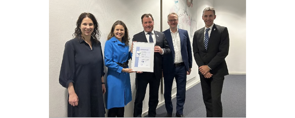 Photo (from left to right): Patricia C. Borna (Managing Director Corporate Communications and Chief Spokesperson, IHK Frankfurt), Melanie Nolte (Vice President, IHK Frankfurt), Wolfgang Marzin (President and Chief Executive Officer, Messe Frankfurt), Dr Thomas Steigleder (Managing Director Innovation and Environment, IHK Frankfurt) and Lennart Schleicher (Managing Director, Envex environmental verification)