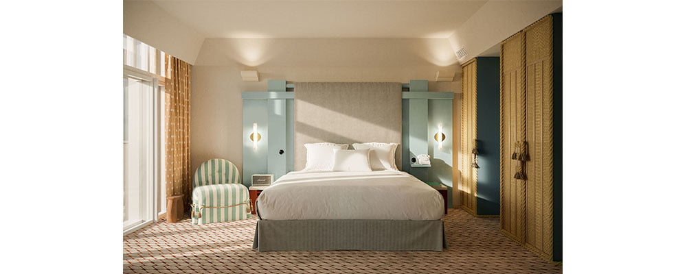 In the Basque Country, collaborator Dorothée Meilichzon has sensitively redesigned Le Regina Experimental to pay homage to its Art Deco origins, drawing inspiration from coastal Atlantic holiday homes and traditional Basque design. Le Regina reopens alongside the recent acquisition of boutique hotel Le Garage, with Experimental Group bringing its edge and sophisticated approach to French coastal hotspot, Biarritz. Standing on a cliff and overlooking the ocean, the Belle Époque building of Le Regina Experimental overlooks Biarritz’s bay of Biscay. Accessible through an art deco atrium, its seventy-two white, blue, and mint green rooms face the sea. The large, preserved bedrooms have been cleverly mixed with local inspirations – neo-Basque architecture, reflecting the close ties of this territory with Japan, and the seaside lifestyle. The decor of the new room and suites has a feel of traditional French coastal homes, featuring a mix of natural elements and comforting textures, such as rope finishings and cord marquetry to project a sense of tranquillity. Armchairs and sofas feature a stripe jacquard design, and room terraces have been elegantly separated by hanging canvases. The hotel features several small lounges, a large orangery, Frenchie Biarritz restaurant, cocktail bar, and spa with an outdoor swimming pool.