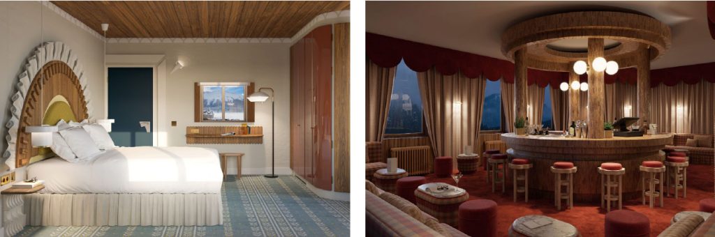 St. Moritz, the pioneering ski resort in the Engadine Valley in the Swiss Alps, is due to welcome Experimental Chalet St. Moritz settled in one of the town’s oldest hotels. with incredible charm. Designed by Dorothée Meilichzon, the chalet features lacquered furniture, inspired by sledge and ski blades, and a contemporary version of Charles Rennie Mackintosh’s highchairs, created at the beginning of the 20th Century. All the furniture in the hotel is original and bespoke: from vintage-shaped sofas to more contemporary elements such as a curved lacquer cabinet and an all-stainless steel bathroom vanity. Home to forty-three rooms, all filled with abundant charm and individually represented by the emblematic sun of St. Moritz (created by graphic designer Walter Herdeg in 1932), symbolising the exceptional sunshine of the ski destination. Experimental Cocktail Club St-Moritz will celebrate the Alpine way of living with its circular mosaic bar counter, a tiled fireplace from the La Courbe workshop and luxurious carpets.