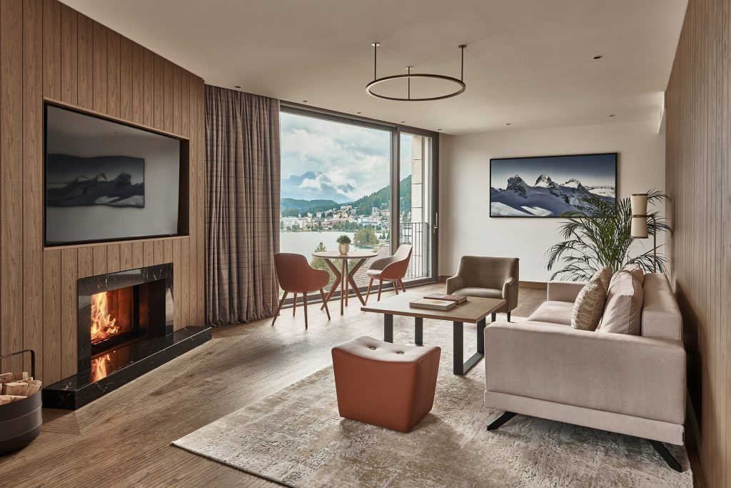 For their initial welcome guests are greeted by the sculptural reception desk, a monolith granite block layered with a brass countertop enhanced by a backdrop of beautiful boiserie detailing which pays homage to the impressive mountain landscape. As guests move through to the communal LIVING ROOM, heritage-protected windows perfectly frame the breathtaking Lake St Moritz. This aquatically-colour-themed room was built around an original marble fireplace, complementing the cerulean Pierre Frey carpet which references the building’s Art Nouveau character, dramatic iron chandeliers, and original arches and vaults restored to their former glory.