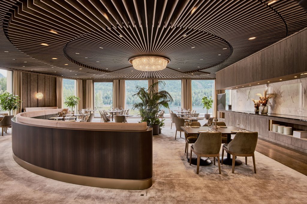 The warmth of St Moritz’s blazing sun is embedded in the new all-day dining restaurant, THE VIEW, constructed in a circular shape with floor-to-ceiling windows. The light earth and green hues of the JAB ANSTOETZ carpet, the soft chocolate notes of the wooden floor, and the sculptured wooden ceiling depicting rays of the sun feel as though Grace La Margna St Moritz has brought the beautiful landscape indoors.
