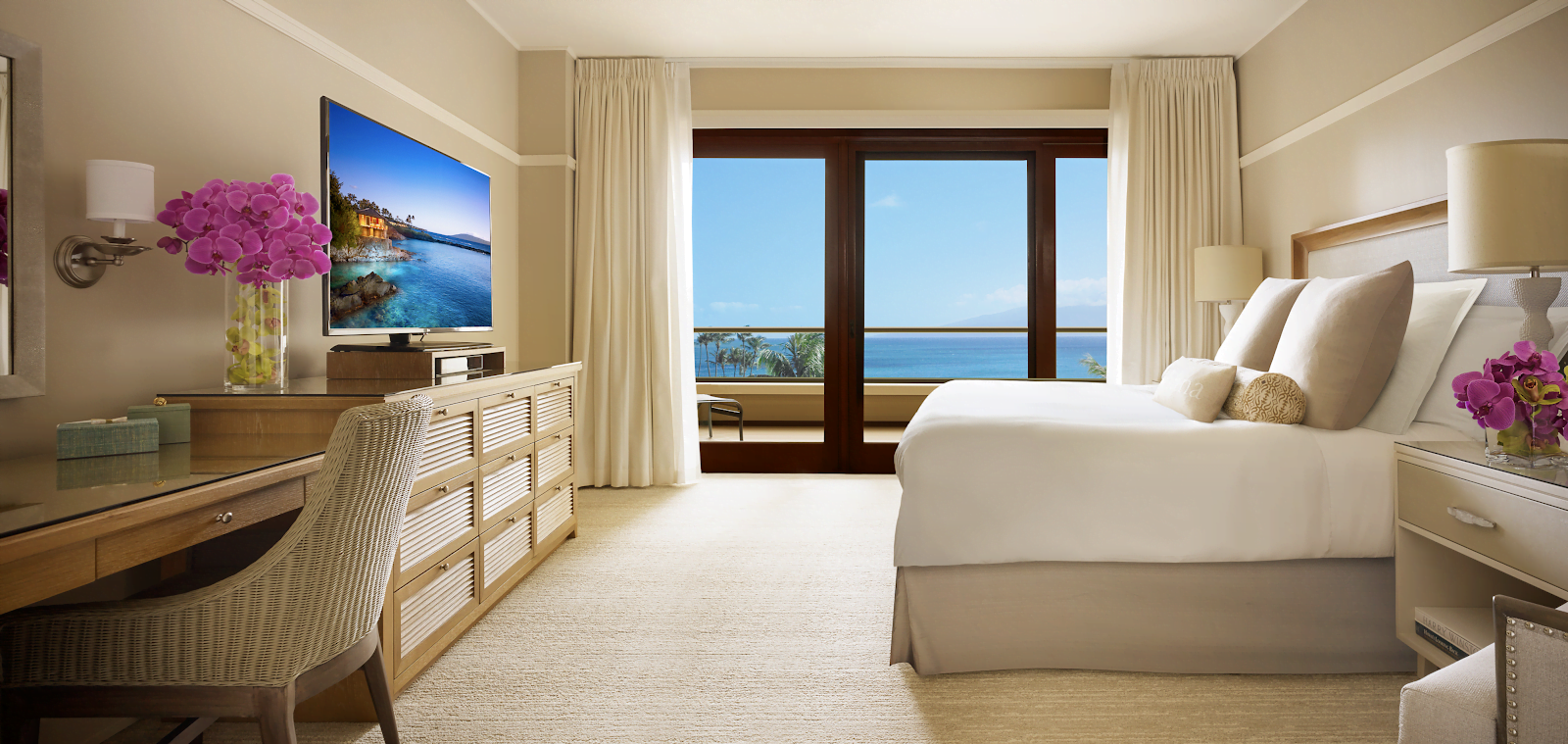 “Our goal was to create a neutral palette with little saturated colours throughout that wouldn’t distract guests from the beauty of Montage Kapalua Bay’s natural surroundings,” said Liz Dauwe, Associate Design Director of Wilson Associates. “There is so much colour around the islands; the canvas of artwork is truly the landscape you see just beyond the interior walls.”