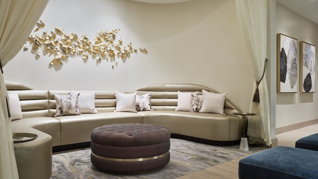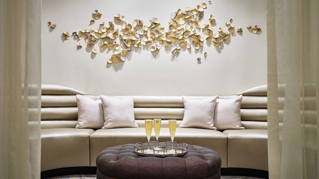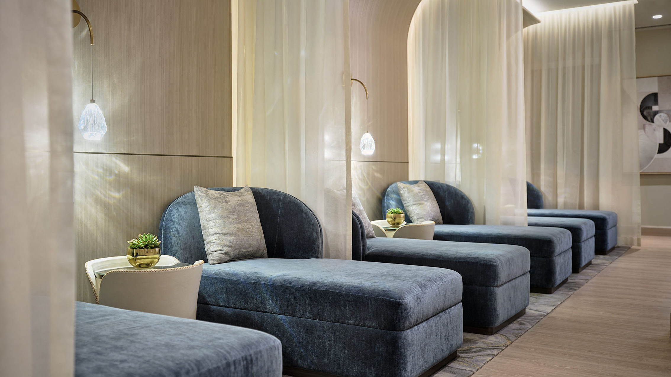 In the relaxation room, contemporary oversized loungers are separated by flowing ivory drapery, providing privacy yet filtered luminosity from the crystalline droplight sconces at each vignette. Wood flooring underfoot delivers the feeling of wellness from nature, while at the rear of the space, an abstract work by artist Amy Rader brings visual calmness. Banquette seating nestled within an alcove is an intimate space for bridal parties and private celebrations, where a sculptural wall installation organically flows above in a graceful exploration of pattern, form and materials.