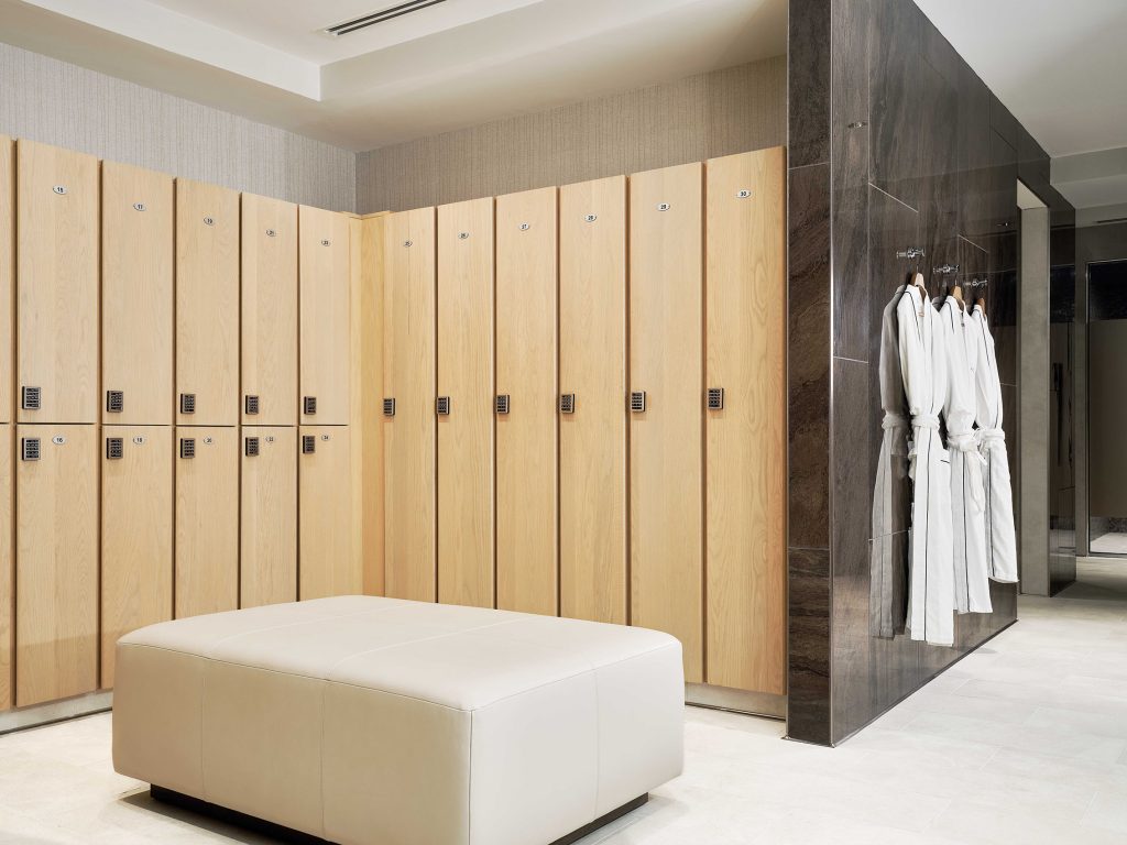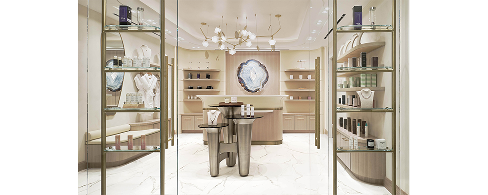 Upon entry to the spa reception, a large-scale agate commissioned from artist Amy Rader anchors the feature wall with grounding presence, inviting balance and harmony into the space. Gold-toned accents recall the warmth of the sun, while smooth finishes provide a transitionary moment for guests. Journeying further into the spa experience at large, variance in texture realizes gentle, soft-spoken change, celebrated through playful applications of light.