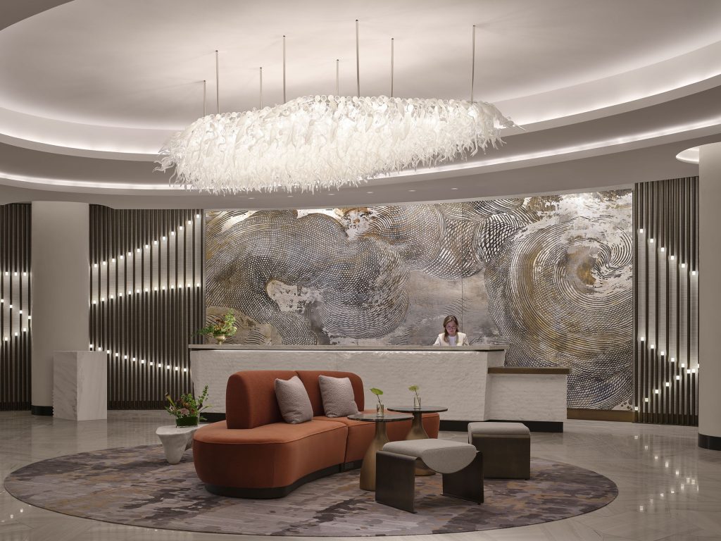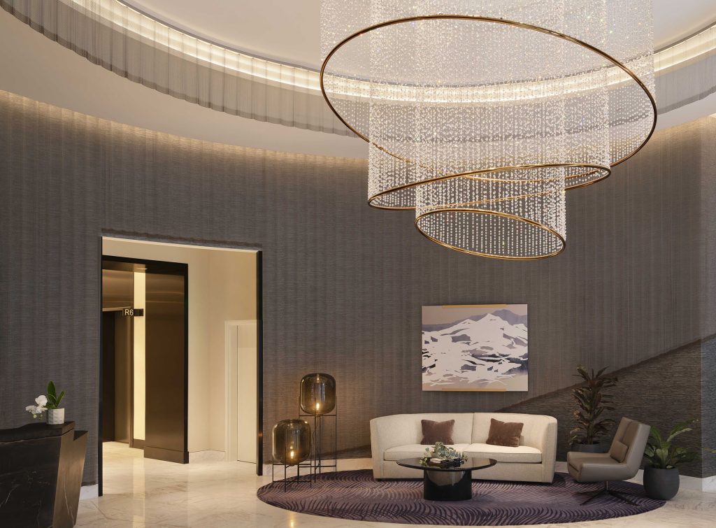 The collection of 141 estates is a haven of exclusivity. Playful geometry, sophisticated serpentine forms, and dramatic lighting make a grand impression upon arrival at the private lobby of the estates situated in the south tower above the hotel. Marble and metal establish a clean, modern palette in the lobby design. A metal chain curtain wraps the walls to form a concentric, multi-tiered chandelier at the center, enhancing the sense of opulence and continuity within the space.