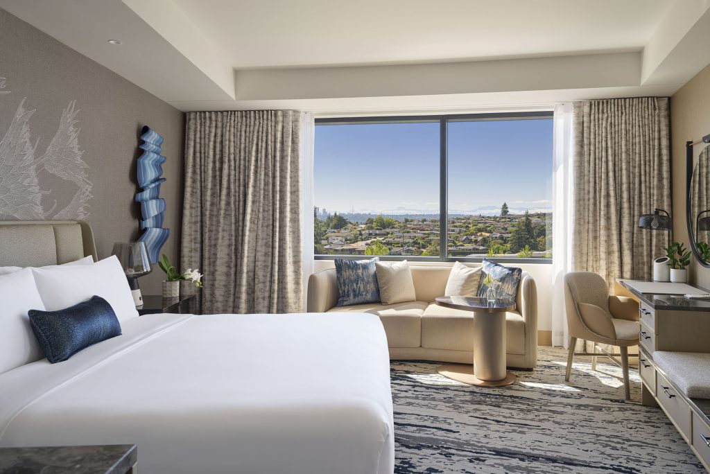 Guest rooms are a study in stylish restraint, at once calming and soothing, in a neutral palette with moments of blue woven through the carpet patterns, artwork and accessory pieces. At the headboard wall is a custom woven wallcovering, where the seemingly hand-stitched detailing depicts wildflowers delicately dancing in the whisper of the wind.