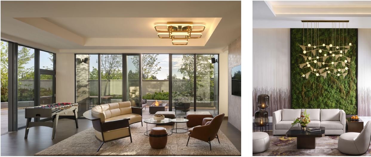 Occupying the west tower, the 224 residences exude urban luxury for vibrant, sophisticated living. Modern lines, textured wall coverings, a fireplace and a biophilic green wall create a layered, tactile welcome. Two color palettes in soft-spoken tonality allow the sweeping views to speak volumes. Bright and restorative, the linen scheme features lighter millwork, countertops and flooring in contrast to the suede scheme characterized by its stately, darker variances.