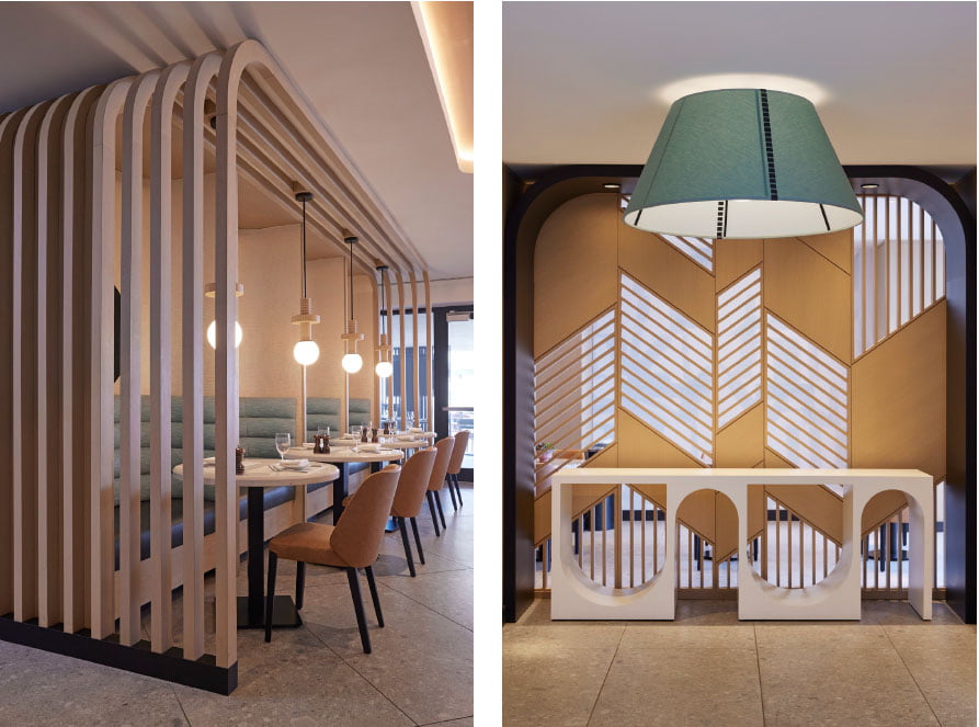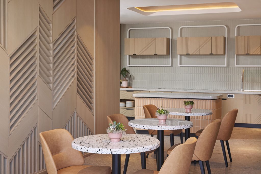 The M Club showcases pastel tones of the colour palette to usher in a more relaxing while still spirited mood. At the entry, an oversized lampshade suspends from the ceiling with distinction. Black metal accents, terrazzo stone at the table tops, ribbed tilework, and geometric screening elements of natural wood continue the storyline rooted in Miami’s culture and history.