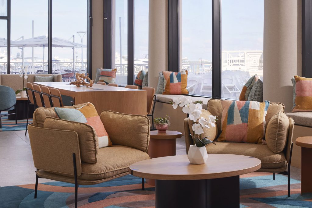 “By relocating the bar and opening up walls, we were able to make the food & beverage experiences more amenable to the environment they’re in by giving them line of sight to the bay,” continued Enriquez. “In the bar area, we focused on deeper shades of teal with pops of murals to cultivate energy. The handmade Italian tiles at the bar front provide cohesiveness with the vernacular of the lobby, yet applied here in an original interpretation. Custom pendant lighting adds further dimension and visual interest.”