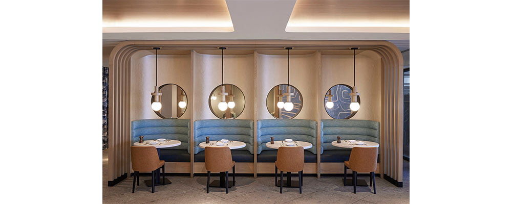 Journeying beyond the lobby leads to the discovery of a new coastal dining concept and bar, Gold Coast Kitchen + Cocktails, as well as the addition of Marriott’s first downtown Miami M Club. Reconfigured to provide connectivity with the outdoors, the restaurant and bar open outward for life and fun to carry onto the waterfront deck, where touches of vibrant colours invigorate the senses and luxurious lounge seating positions guests for dining with a view. Inside the restaurant, the dining room design takes cues from Streamline Moderne style with contemporary sensibilities in a watercolour-like palette. A banquette serves as a playful diversion with structural relevance, punctuated by porthole-like openings in an affectionate nod to Miami’s cruise industry while also maintaining visual connection within the space. Fluted blue tiling in the buffet area brings an element of texture and is illuminated by rope-like lighting for a moment of understated theatricality.
