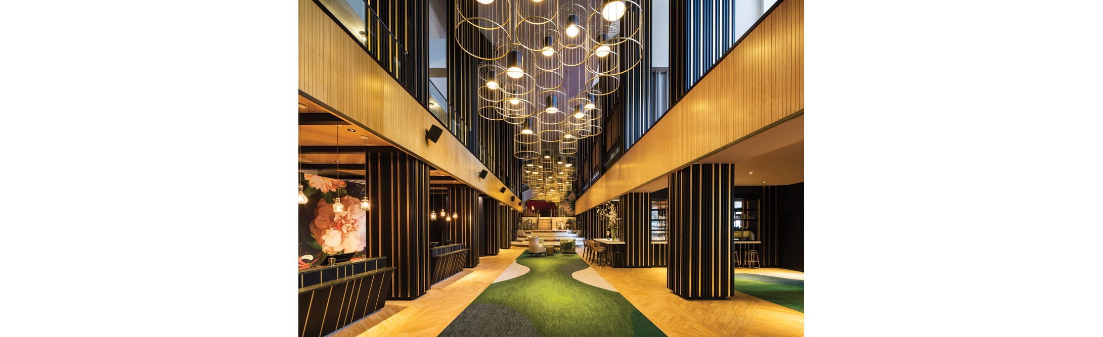 Drawing from Atlanta’s home within a forest and all the beautiful flora and fauna in the city, the design for the public spaces, including Welcome and the Living Room, features a forbidden garden motif. In addition to the floral overtones, the spaces include curated art that a world traveler would collect, reflecting how Atlanta is the gateway to anywhere in the world. The Living Room ceiling displays a mural with large colorful flowers that pop against a sharp black background conceptualized by Virserius Studio and executed by DAC. Oversized pendant light fixtures shaped like birdcages dot the ceiling for a dramatic effect, while butterfly and flower sculptures, created by Prince Design UK and Redwood Stoneworks, are seen throughout the space.