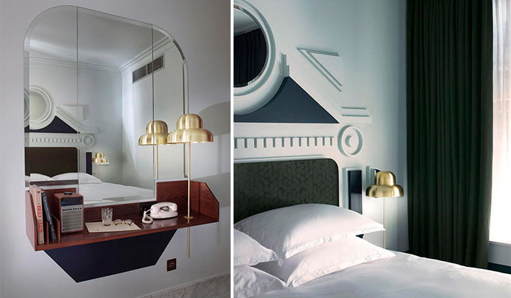 Bold colours, brass bedside lights, 70s retro armchairs with brushed aluminium elements inspired by Pierre Paulin, Carrara marble skirting, Terazzo shape carpets and Dorothée’s famous hand-made bed heads resembling Milanese doorframes will make up the look of the unique rooms. Inspired by the roofs in the street, the sinks in the bathrooms are made from two pieces of granite placed at 90°, they’ll be joined by large mirrors and black and white octagonal floor tiles and cabochons.