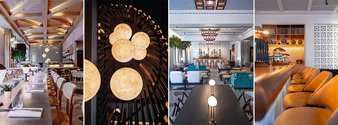Soft textures, furnishings and warm lighting will guide guests through to Tavla, the hotel’s bar where guests and locals alike will be encouraged to relax and spend time throughout the day and into the evening. Here, textured woven stools are mixed in with lounge chairs in muted tones and softened textures giving the space a modern, residential feel. The restaurant BARBOUN, boasts an industrial-luxe aesthetic with rattan and Thonet-style chairs and partitions inspired by the Victorian furniture makers workshops of Great Eastern Street. Warmth and softness is brought into the space through natural linen café curtains, drapery in deep oxblood and upholstery in nude leather; as well as the asymmetric architecture of the vast timber ceiling replicating the beamed structure of a factory warehouse. A striking steel re-bar and copper staircase sits towards the back of the space along with a central cascade of moon chandeliers.